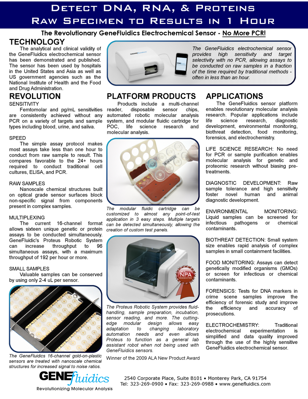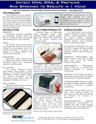 Bionanotechnology and electrochemistry provide the foundations for GeneFluidics' testing platform. Unlike traditional detection methods such as optical analysis, the patented GeneFluidics electrochemical sensor maintains high sensitivity even in unamplified, raw, and mixed samples. Proprietary nanometer-scale sensor surface treatments and a novel detection method provide for the ultra-sensitivity of our electrochemical sensor.